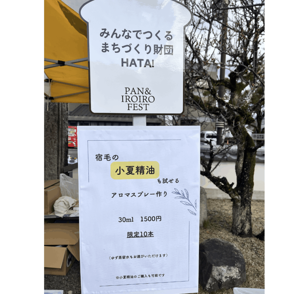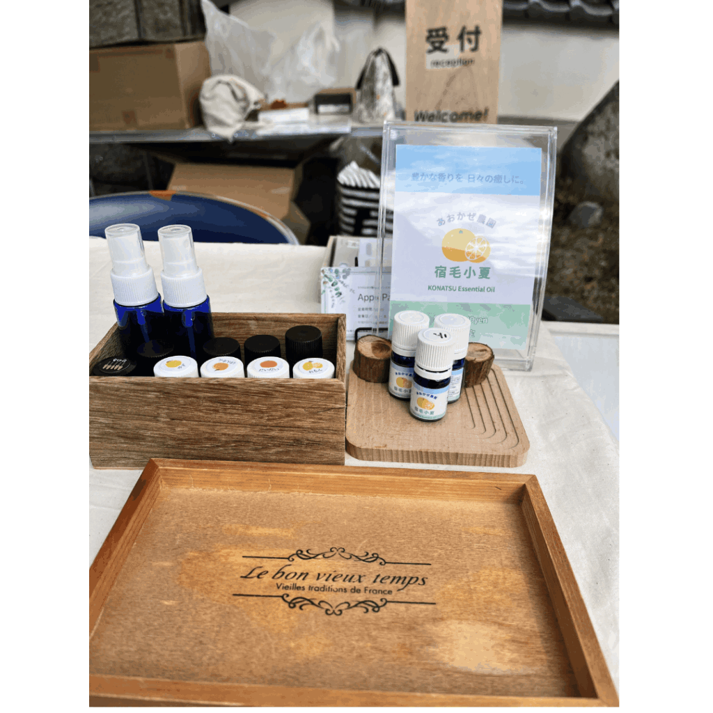 宿毛市にゆかりのある小夏精油をぜひ試していただきたいという想いもあり、HATAのブース内でアロマスプレー作りを行いました。